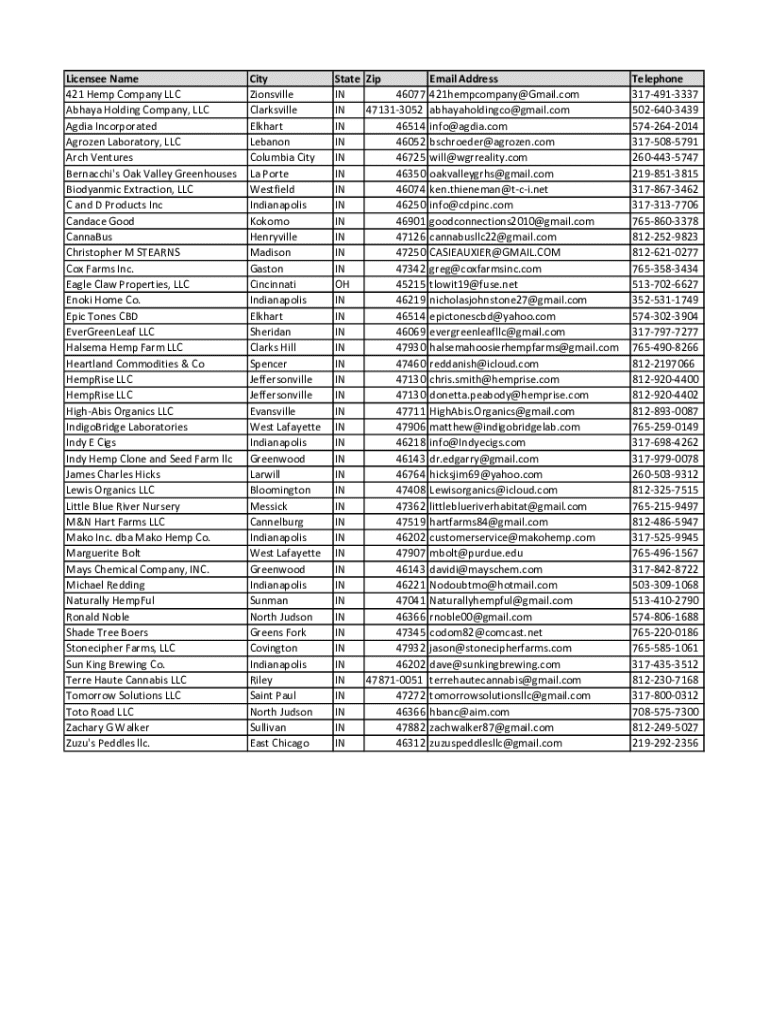 Get the free Licensee Name City State Zip Email Address Telephone 421 Hemp ...
