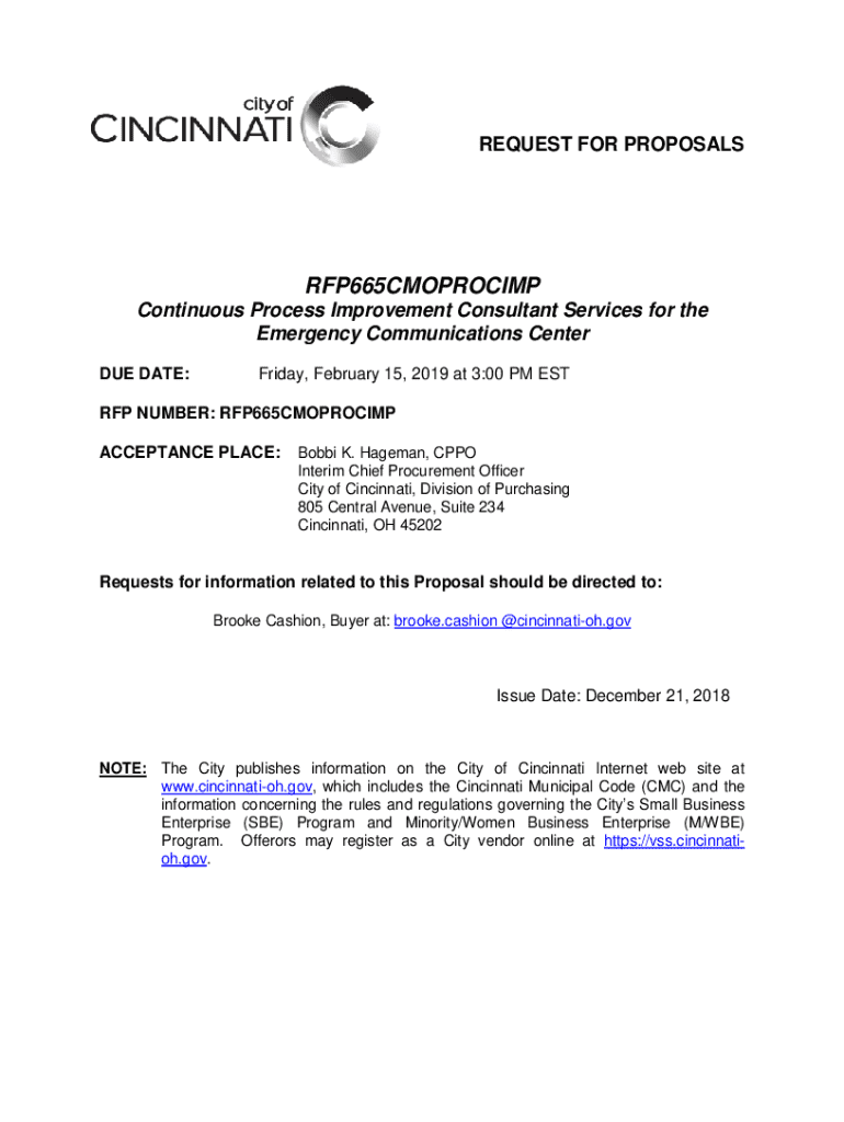 REQUEST FOR PROPOSALSRFP665CMOPROCIMP Continuous Process Improvement Consultant Services for the Emergency Communications Center DUE DATE:Friday, February 15, 2019, at 3:00 PM EST RFP NUMBER: RFP665CMOPROCIMP