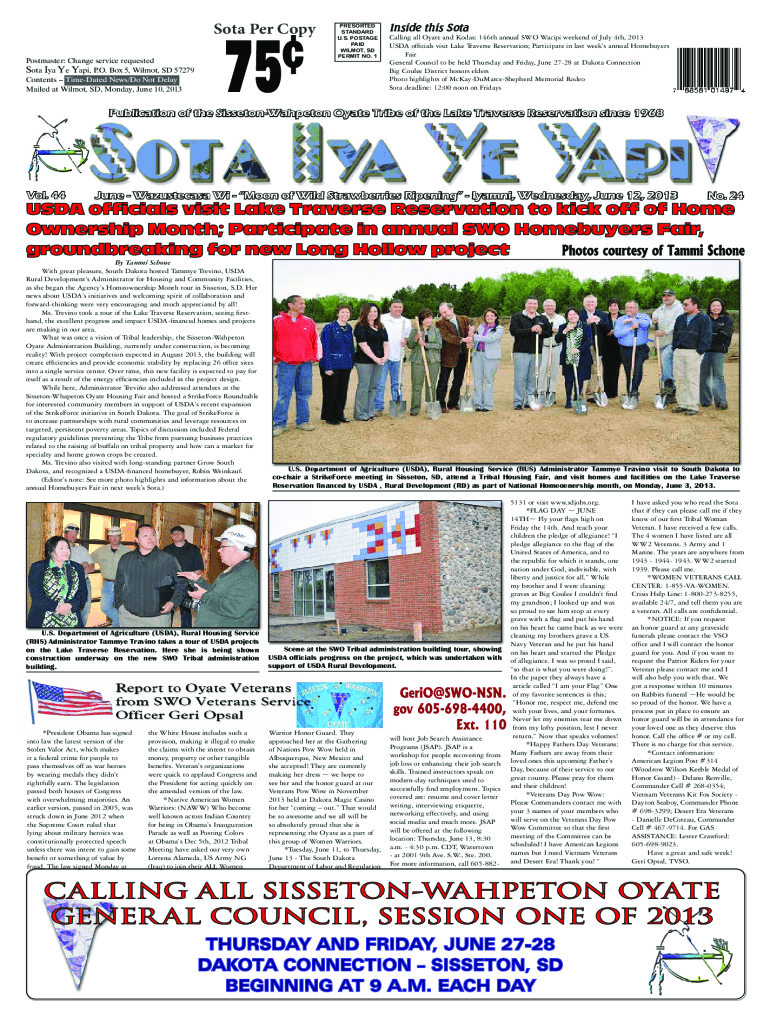 75Sota Per Copy Postmaster: Change service requested Sota Iya Ye Yapi, P.O. Box 5, Wilmot, SD 57279 Contents TimeDated News/Do Not Delay Mailed at Wilmot, SD, Monday, June 10, 2013PRESORTED STANDARD