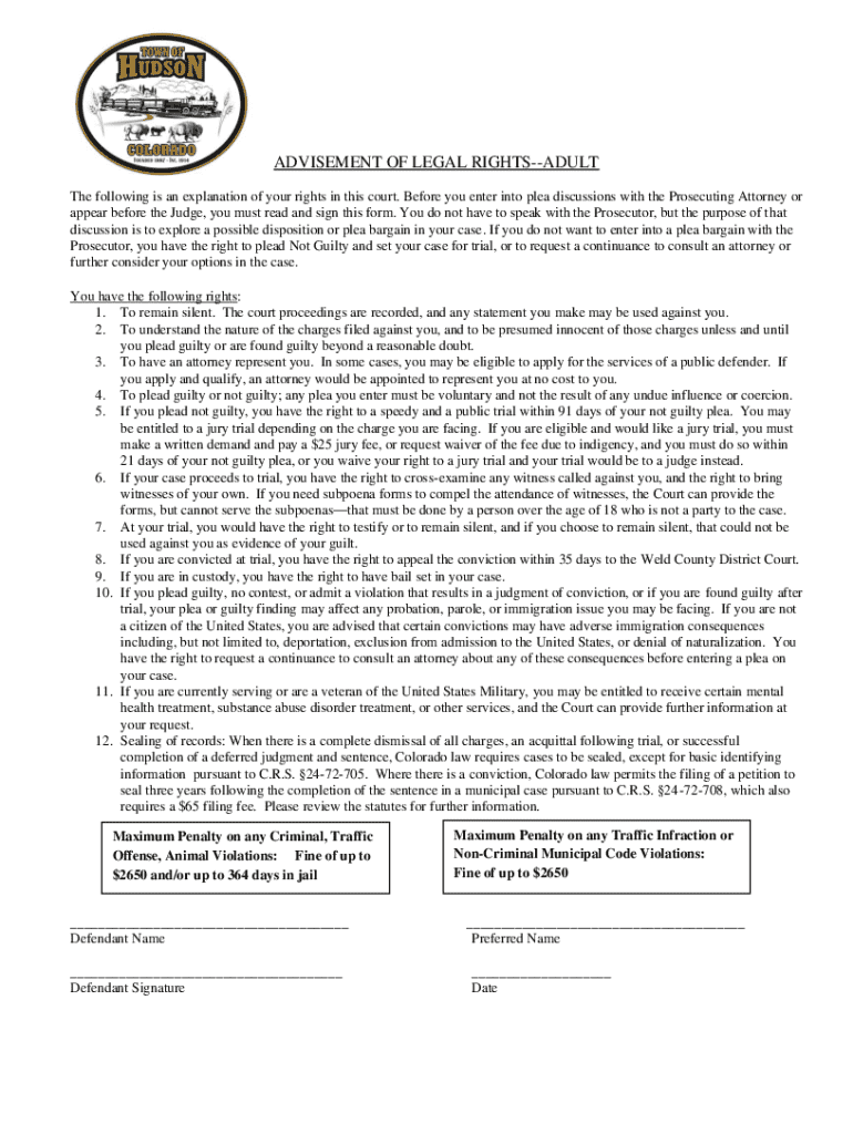 ADVISEMENT OF LEGAL RIGHTSADULT The following is an explanation of your rights in this court. Before you enter into plea discussions with the Prosecuting Attorney or appear before the Judge, you must