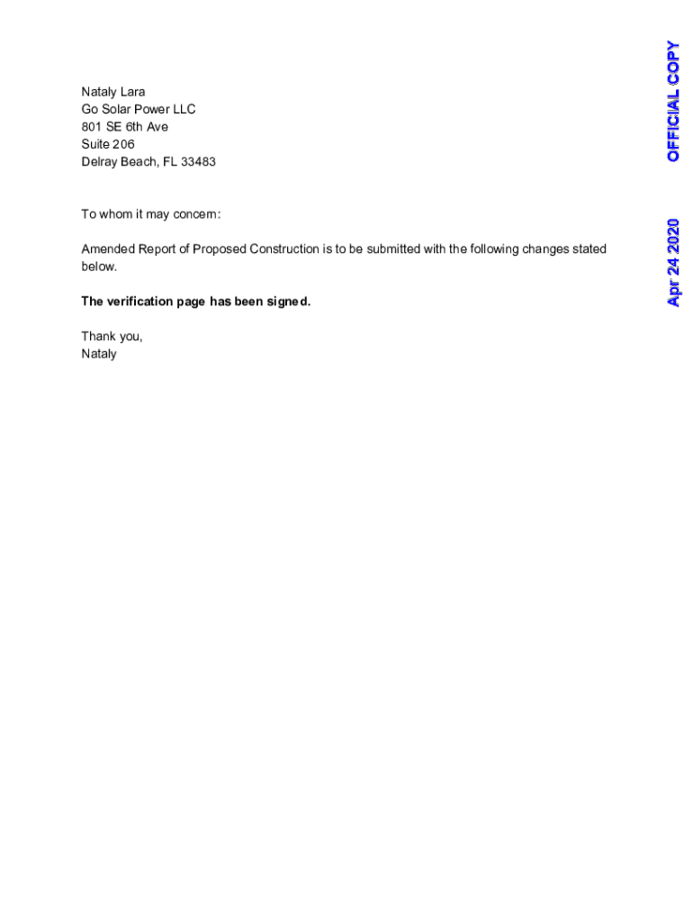 Natal Lara Go Solar Power LLC 801 SE 6th Ave Suite 206 Delray Beach, FL 33483To whom it may concern: Amended Report of Proposed Construction is to be submitted with the following changes stated below.
