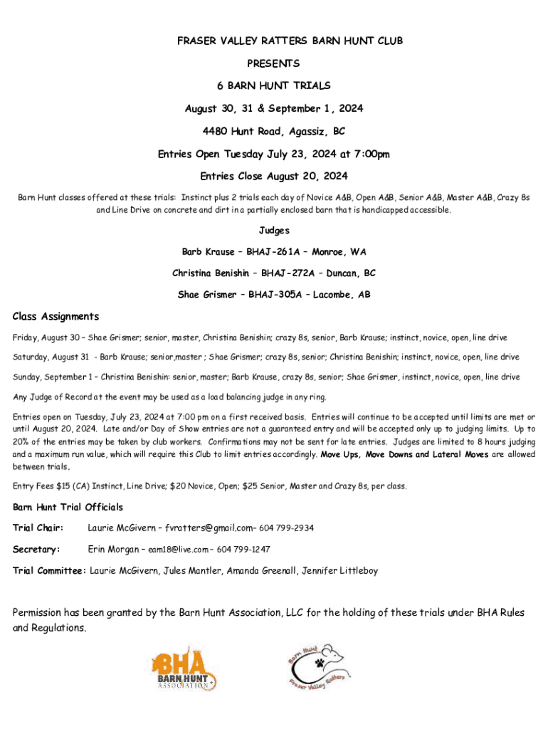 FRASER VALLEY RATTERS BARN HUNT CLUB PRESENTS 6 BARN HUNT TRIALS August 30, 31 & September 1, 2024 4480 Hunt Road, Agassiz, BC Entries Open Tuesday July 23, 2024 at 7:00pm Entries Close August 20,
