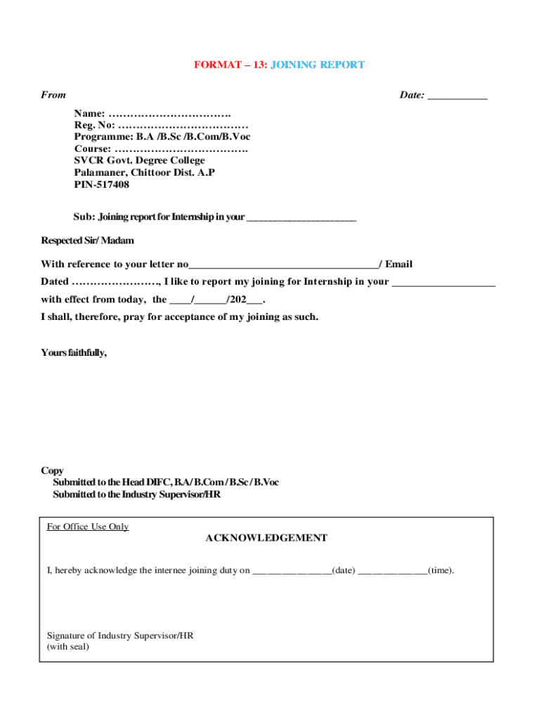 FORMAT 13: JOINING REPORT FromDate: ___ Name: . Reg. No: Programme: B.A /B.Sc /B.Com/B.Voc Course: . SVCR Govt. Degree College Palamaner, Chittoor Dist. A.P PIN517408 Sub: Joining report for Internship