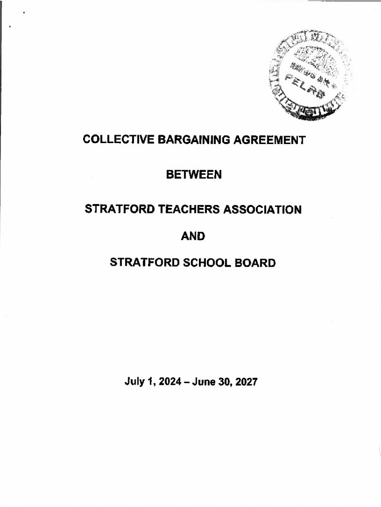 COLLECTIVE BARGAINING AGREEMENT BETWEEN STRATFORD TEACHERS ASSOCIATION AND STRATFORD SCHOOL BOARD July 1,2024June 30, 2027Contents PREAMBLE ARTICLE I RECOGNITION ARTICLE II NO DISCRIMINATION D ARTICLE