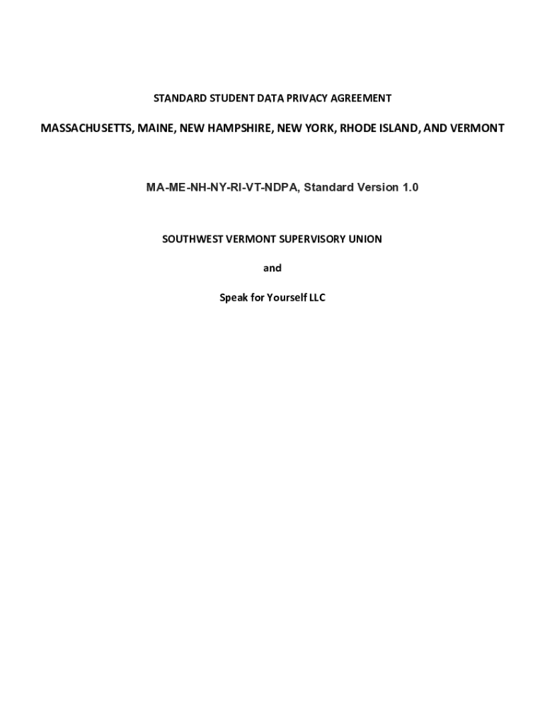 STANDARD STUDENT DATA PRIVACY AGREEMENTMASSACHUSETTS, MAINE, NEW HAMPSHIRE, NEW YORK, RHODE ISLAND, AND VERMONTMAMENHNYRIVTNDPA, Standard Version 1.0SOUTHWEST VERMONT SUPERVISORY UNION and o YouThis