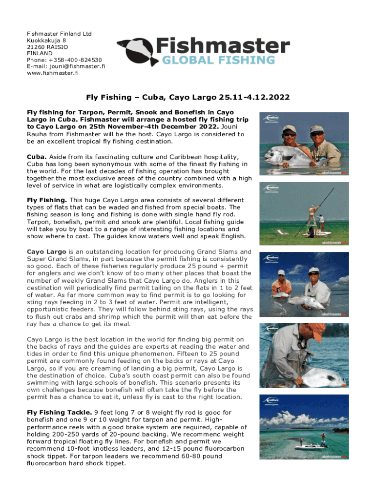 Fishmaster Finland Ltd Kuokkakuja 8 21260 RAISIO FINLAND Phone: +358400824530 Email: jouni@fishmaster.fi www.fishmaster.fiFly Fishing Cuba, Cayo Largo 25.114.12.2022 Fly fishing for Tarpon, Permit,