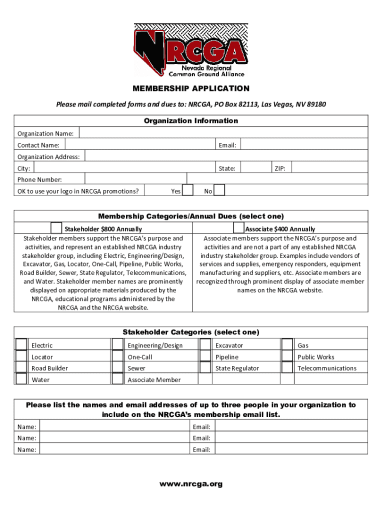 MEMBERSHIP APPLICATION Please mail completed forms and dues to: NRCGA, PO Box 82113, Las Vegas, NV 89180 Organization Information Organization Name: Contact Name:Email:Organization Address: City:State:ZIP:Phone