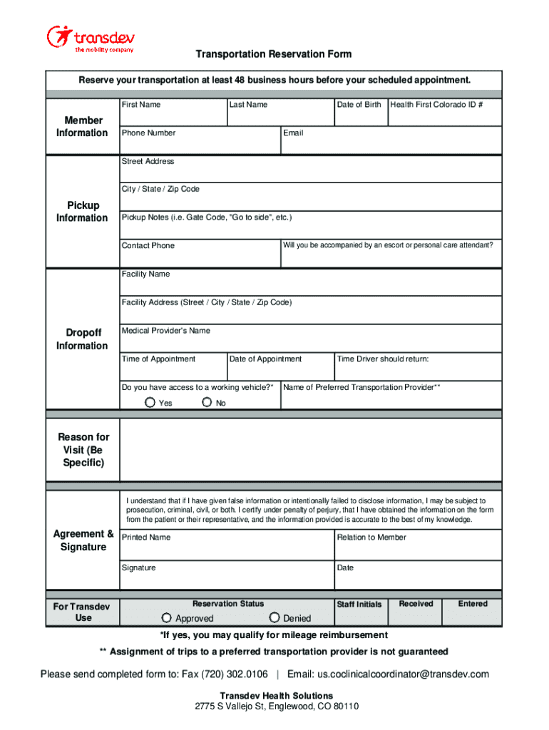 To fill out the transportation reservation form member, you need to provide details such as the date, time, pick-up location, drop-off location, number of passengers, and any special requests.