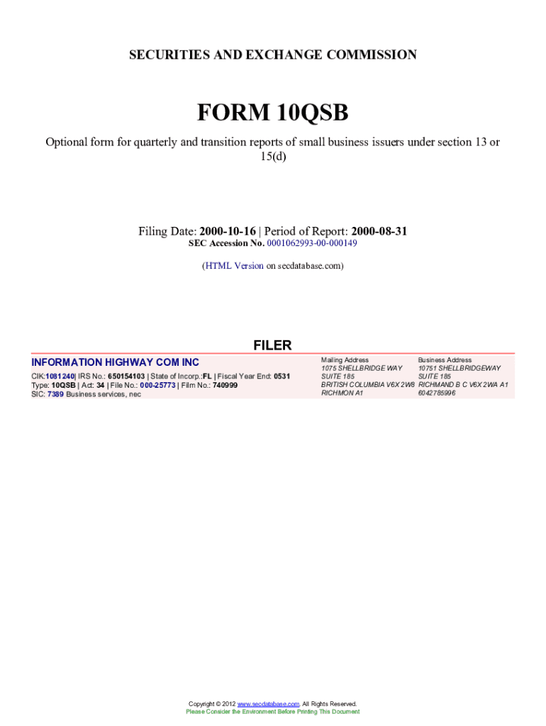 Get the free INFORMATION HIGHWAY COM INC (Form. Accession Number