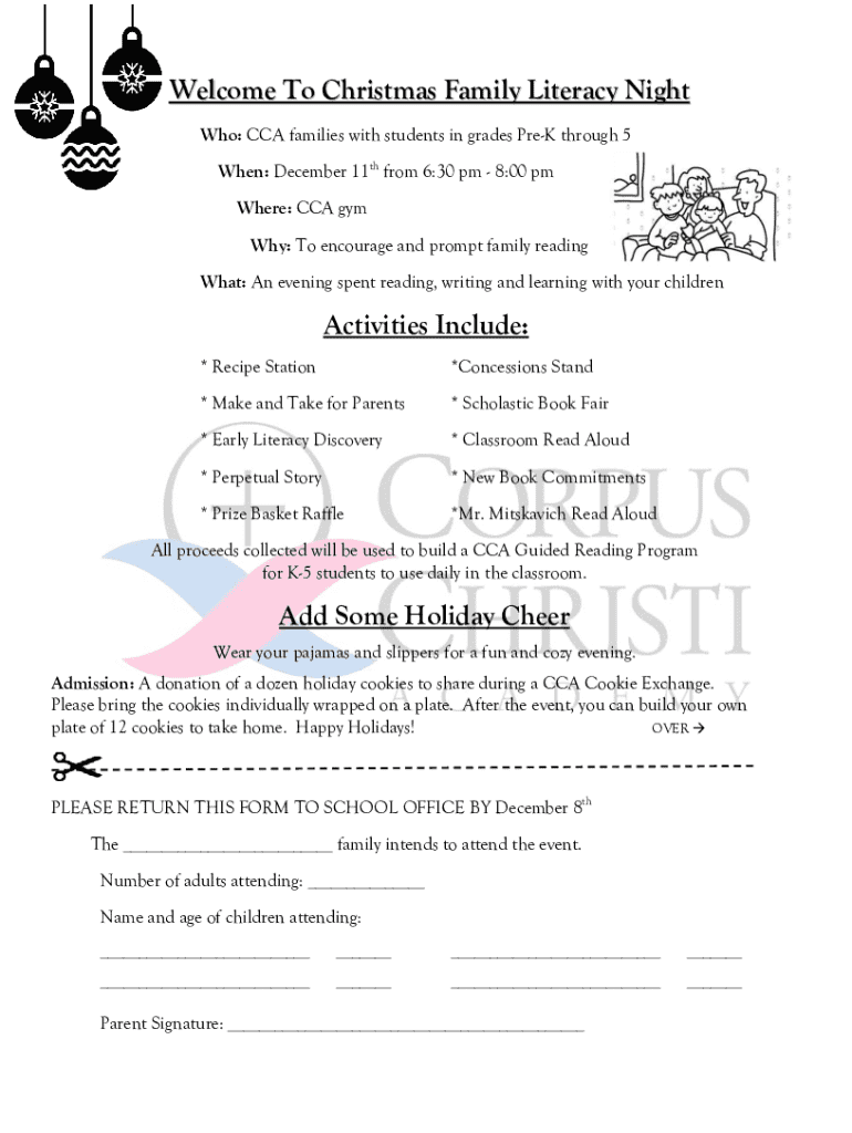 Welcome To Christmas Family Literacy Night Who: CCA families with students in grades Prey through 5 When: December 11th from 6:30 pm 8:00 pm Where: CCA gym Why: To encourage and prompt family reading