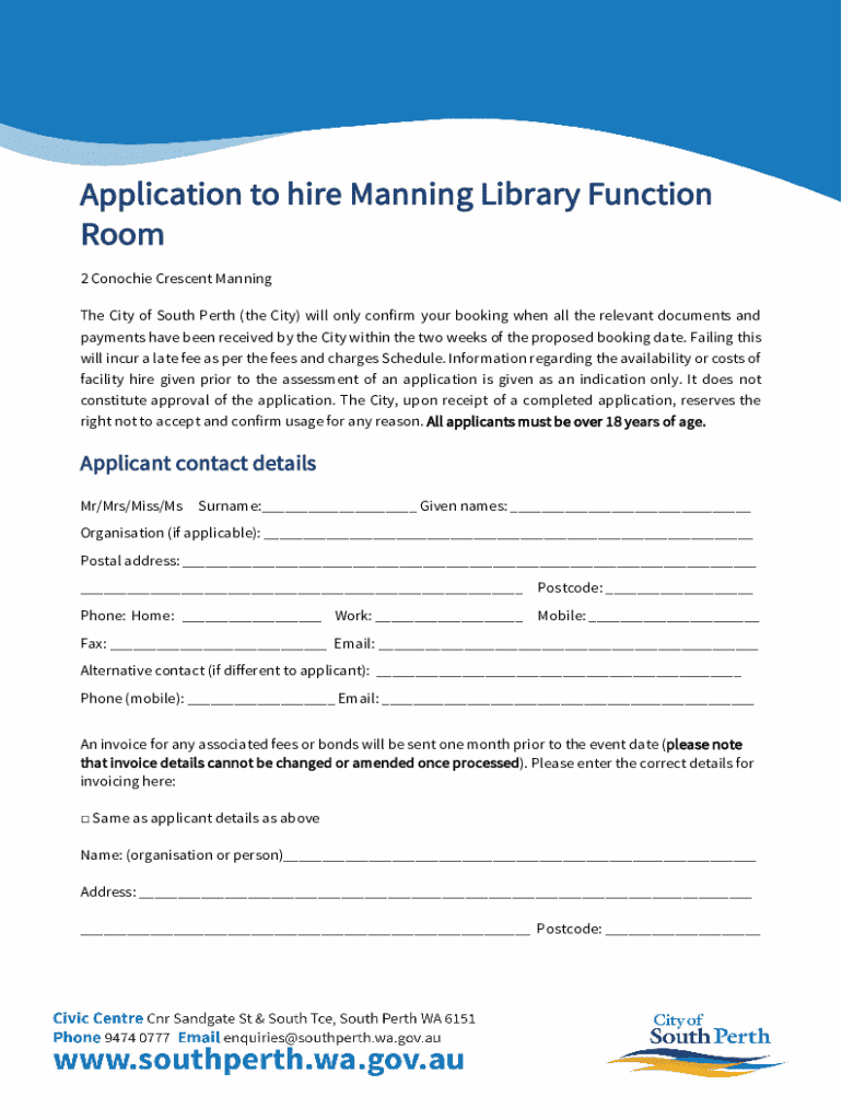 Application to hire Manning Library Function Room 2 Conochie Crescent Manning The City of South Perth (the City) will only confirm your booking when all the relevant documents and payments have been