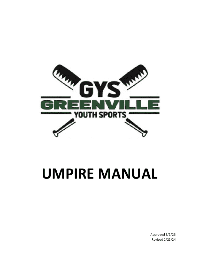 UMPIRE MANUALApproved 3/1/23 Revised 1/21/24Table of Contents General Information .. 3 Game Balls ... 4 Rules .... 4 Pregame Meeting ...... 5 Umpire