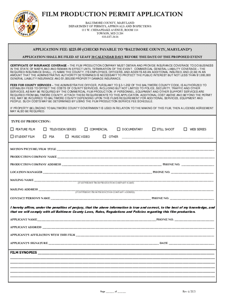 FILM PRODUCTION PERMIT APPLICATION BALTIMORE COUNTY, MARYLAND DEPARTMENT OF PERMITS, APPROVALS AND INSPECTIONS 111 W. CHESAPEAKE AVENUE, ROOM 114 TOWSON, MD 21204 4108873616APPLICATION FEE: $225.00