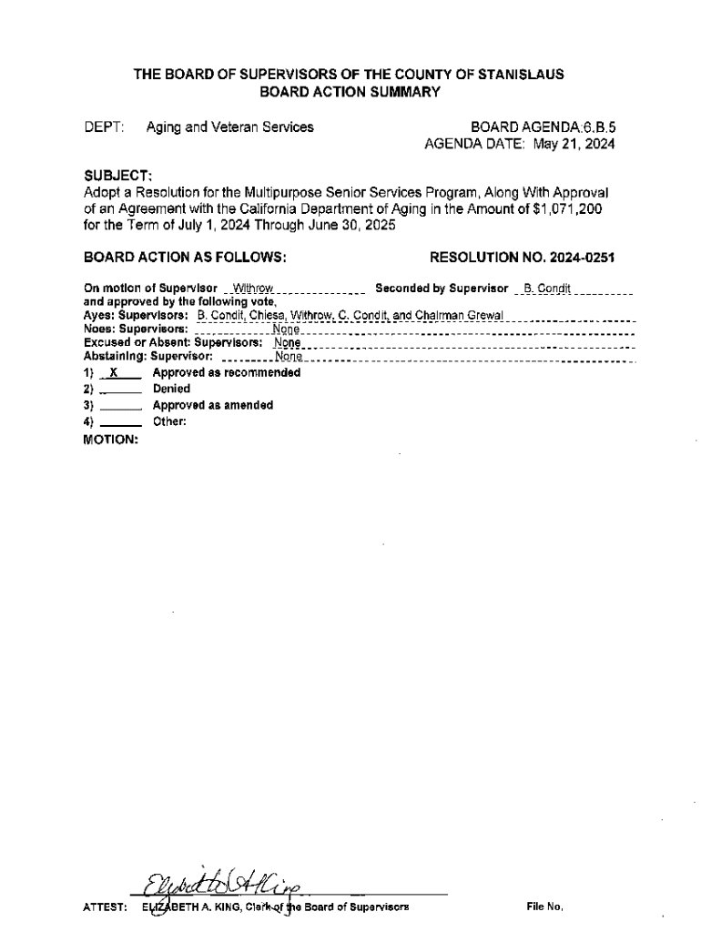 THE BOARD OF SUPERVISORS OF THE COUNTY OF STANISLAUS BOARD ACTION SUMMARY DEPT:Aging and Veteran ServicesBOARD AGENDA:6. B.5 AGENDA DATE: May 21, 2024SUBJECT: Adopt a Resolution for the Multipurpose