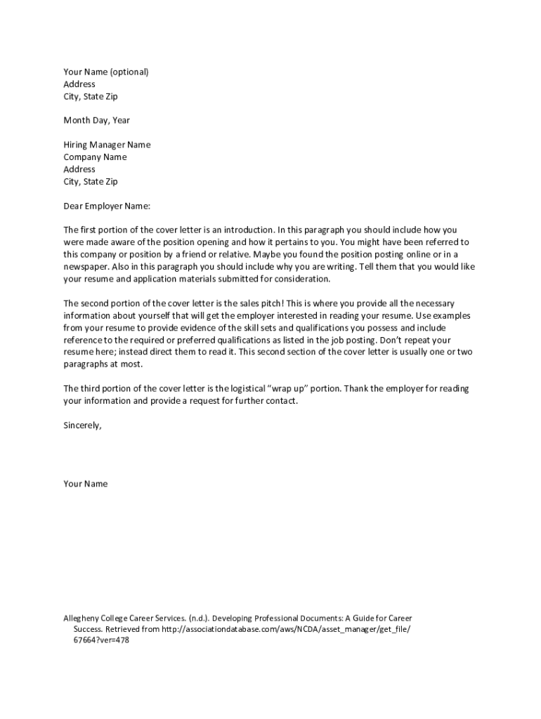 Your Name (optional) Address City, State Zip Month Day, Year Hiring Manager Name Company Name Address City, State Zip Dear Employer Name: The first portion of the cover letter is an introduction.
