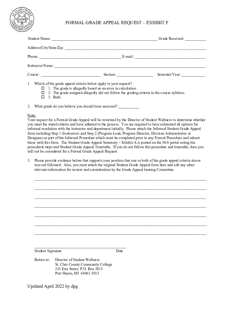 FORMAL GRADE APPEAL REQUEST EXHIBIT F Student Name: ___ Grade Received: ___ Address/City/State/Zip: ___ Phone: ___ Email: ___ Instructor Name: ___ Course : ___ Section: ___Semester/Year: ___1. Which