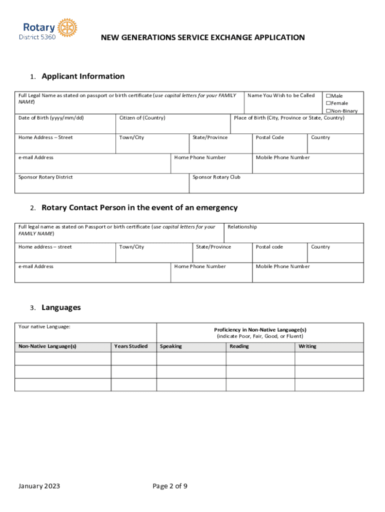 New Generations Service ExchangeExchange Application FormNEW GENERATIONS SERVICE EXCHANGE APPLICATION1. Applicant Information Male Female NonBinary Place of Birth (City, Province or State, Country)Full
