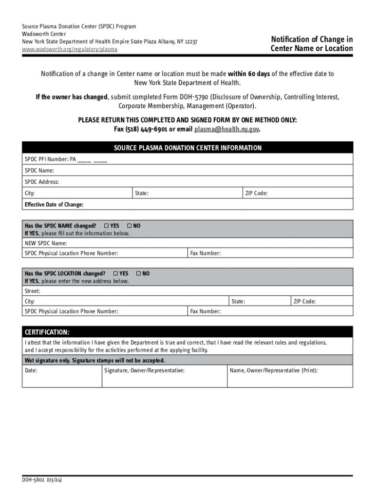 Source Plasma Donation Center (SPDC) Program Wadsworth Center New York State Department of Health Empire State Plaza Albany, NY 12237 www.wadsworth.org/regulatory/plasmaNotification of Change in Center