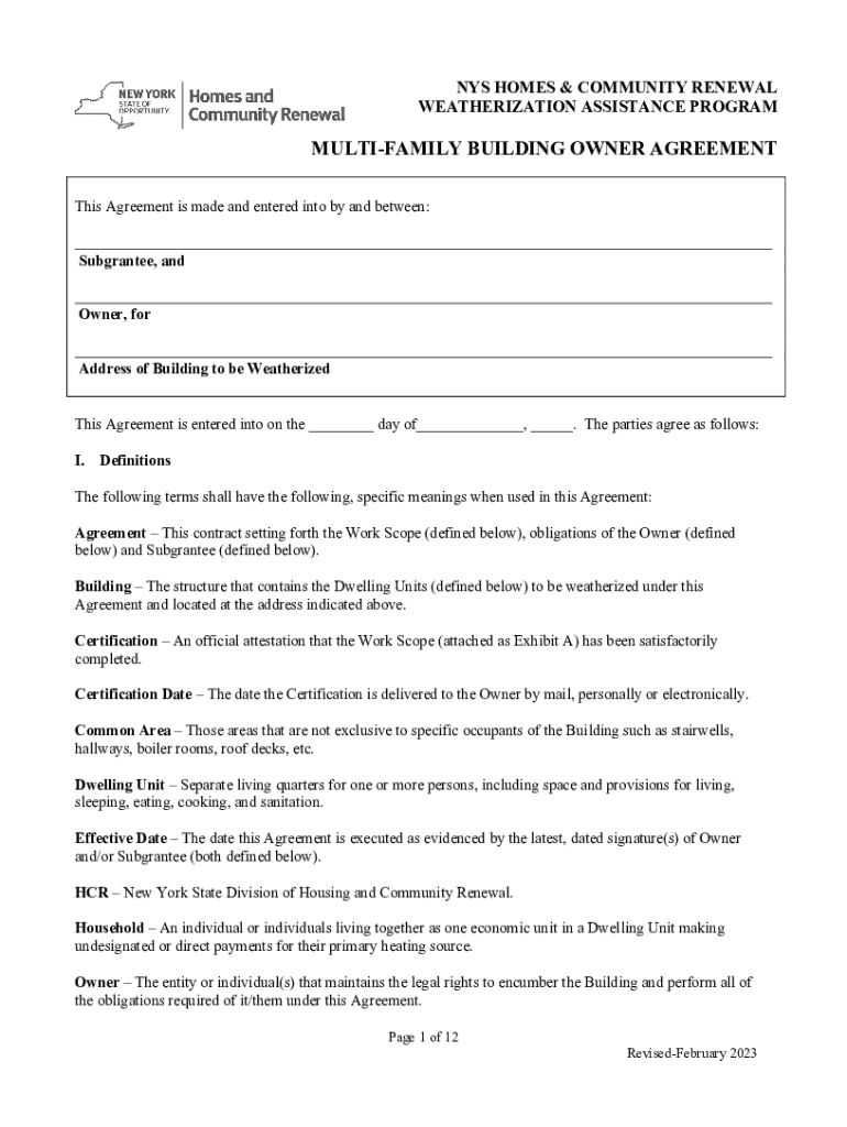NYS HOMES & COMMUNITY RENEWAL WEATHERIZATION ASSISTANCE PROGRAMMULTIFAMILY BUILDING OWNER AGREEMENT This Agreement is made and entered into by and between: Subgrantee, and Owner, for Address of Building