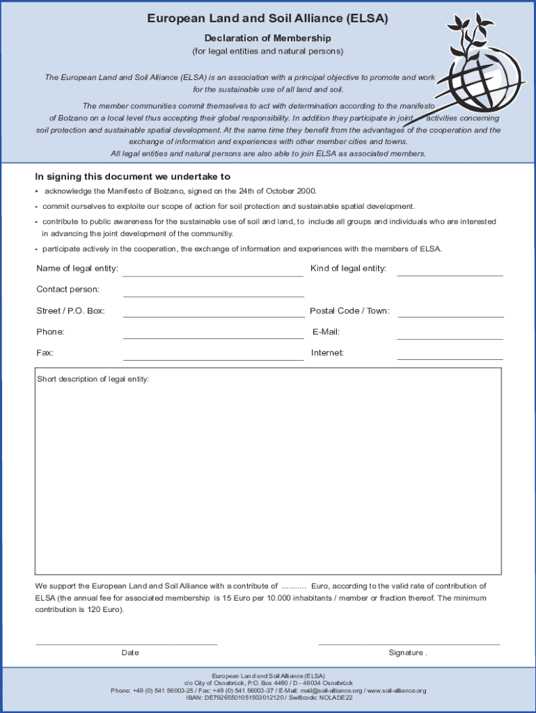 European Land and Soil Alliance (ELSA) Declaration of Membership (for legal entities and natural persons) The European Land and Soil Alliance (ELSA) is an association with a principal objective to