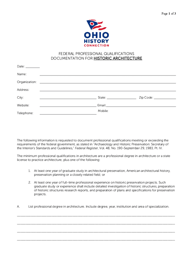 Page 1 of 3FEDERAL PROFESSIONAL QUALIFICATIONS DOCUMENTATION FOR HISTORIC ARCHITECTURE Date: Name: Organization: Address: City:State:Website:Email:Telephone:Zip Code:Mobile:The following information