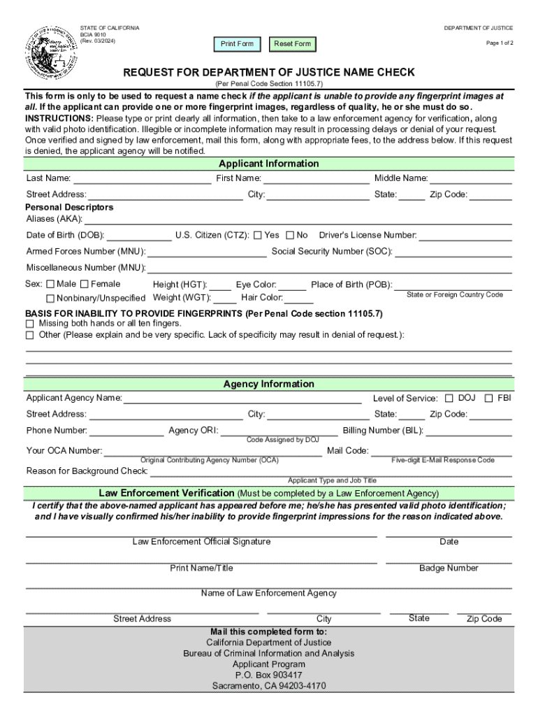 STATE OF CALIFORNIA BCIA 9010 (Rev. 03/2024)DEPARTMENT OF JUSTICEPrint FormReset FormPage 1 of 2REQUEST FOR DEPARTMENT OF JUSTICE NAME CHECK (Per Penal Code Section 11105.7)This form is only to be