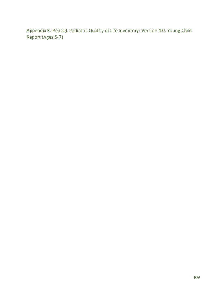 Appendix K. Pedal Pediatric Quality of Life Inventory: Version 4.0. Young Child Report (Ages 57)109ID# ___ Date:___ _PedsQLPediatric Quality of Life Inventory Version 4.0 YOUNG CHILD REPORT (ages