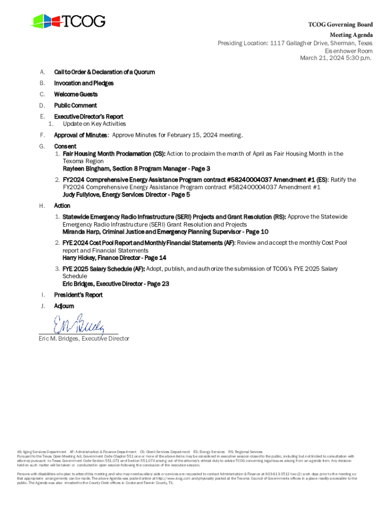 TCOG Governing Board Meeting Agenda Presiding Location: 1117 Gallagher Drive, Sherman, Texas Eisenhower Room March 21, 2024 5:30 p.m. A.Call to Order & Declaration of a QuorumB.Invocation and PledgesC.Welcome