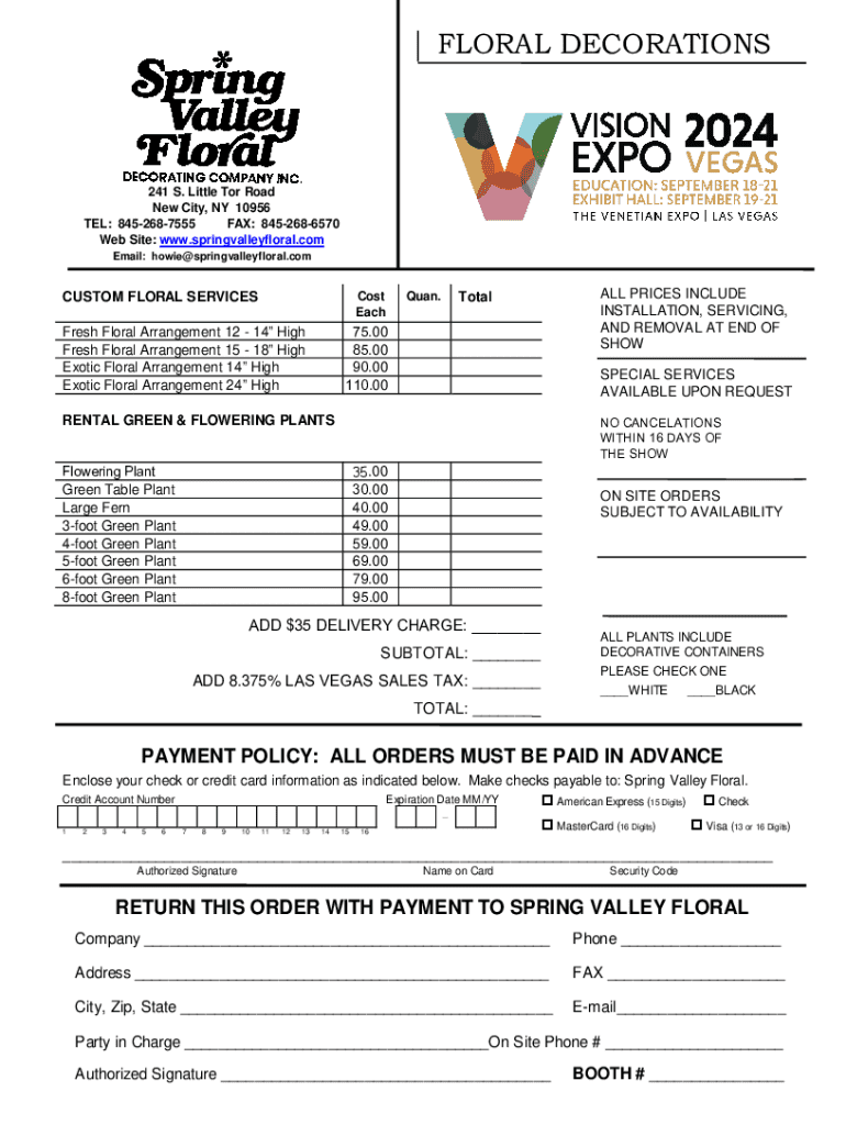 FLORAL DECORATIONS241 S. Little Tor Road New City, NY 10956 TEL: 8452687555 FAX: 8452686570 Website: www.springvalleyfloral.com Email: howie@springvalleyfloral.comCUSTOM FLORAL SERVICESCost Each ALL