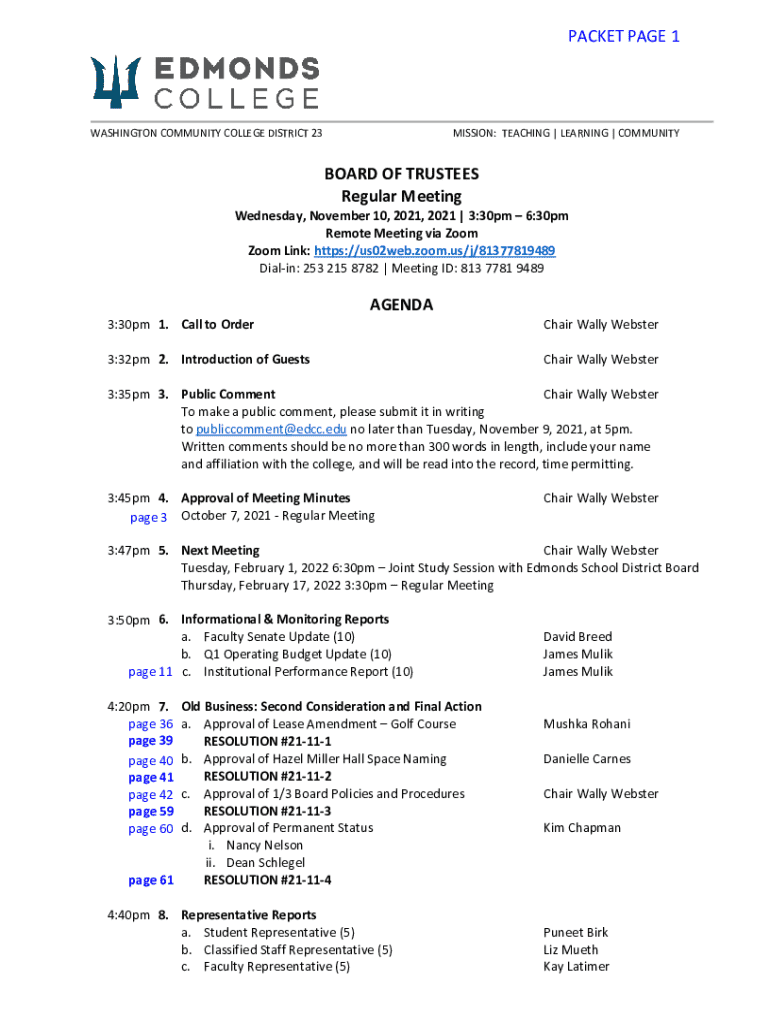 PACKET PAGE 1WASHINGTON COMMUNITY COLLEGE DISTRICT 23MISSION: TEACHING | LEARNING | COMMUNITYBOARD OF TRUSTEES