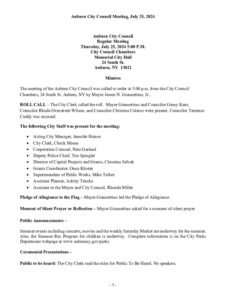 Auburn City Council Meeting, July 25, 2024Auburn City Council Regular Meeting Thursday, July 25, 2024 5:00 P.M. City Council Chambers Memorial City Hall 24 South St. Auburn, NY 13021 Minutes The meeting