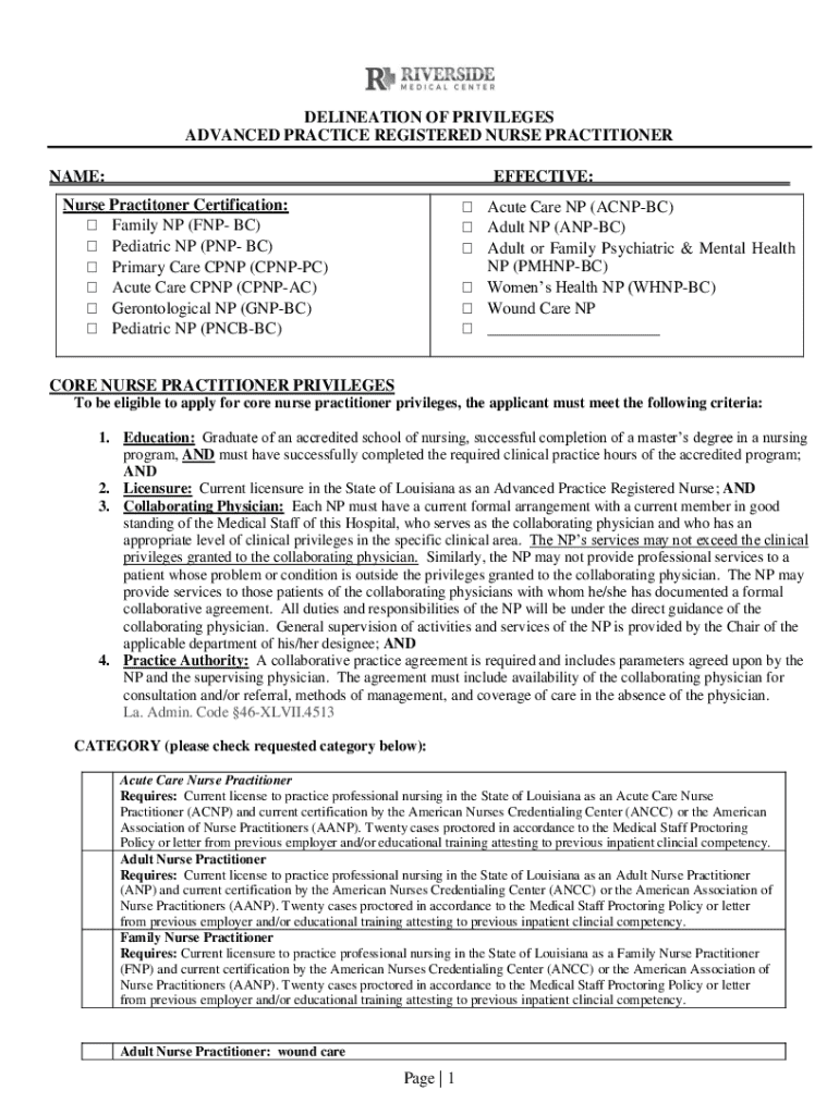 DELINEATION OF PRIVILEGES ADVANCED PRACTICE REGISTERED NURSE PRACTITIONER NAME:EFFECTIVE: Acute Care NP (ACNPBC) Adult NP (ANPBC) Adult or Family Psychiatric & Mental Health NP (PMHNPBC) Womens Health
