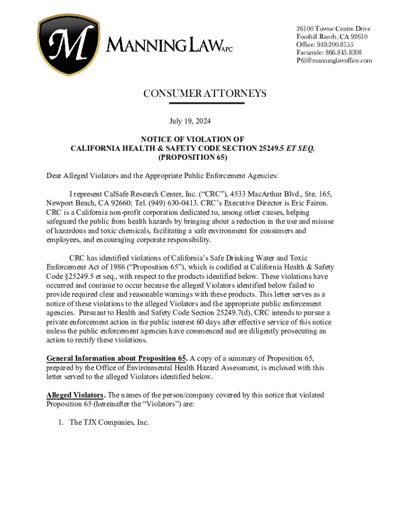 26100 Town Center Drive Foothill Ranch, CA 92610 Office: 949.200.8755 Facsimile: 866.843.8308 P65@manninglawoffice.comCONSUMER ATTORNEYS July 19, 2024, NOTICE OF VIOLATION OF CALIFORNIA HEALTH & SAFETY