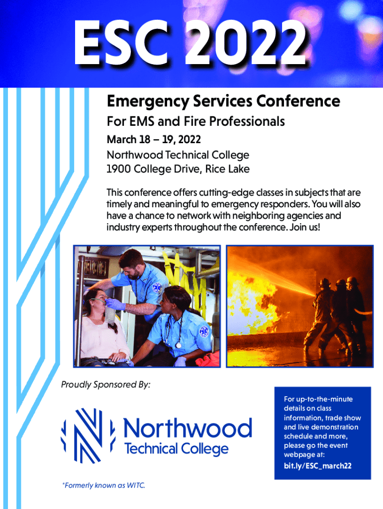 ESC 2022 Emergency Services Conference For EMS and Fire Professionals March 18 19, 2022 Northwood Technical College 1900 College Drive, Rice Lake This conference offers cuttingedge classes in subjects