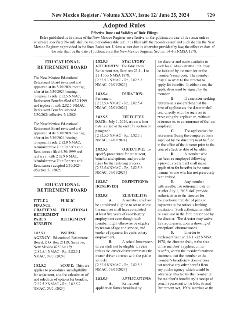 New Mexico Register / Volume XXXV, Issue 12/ June 25, 2024729Adopted Rules Effective Date and Validity of Rule Filings Rules published in this issue of the New Mexico Register are effective on the