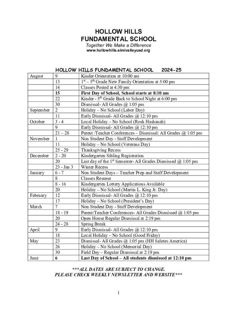 HOLLOW HILLS FUNDAMENTAL SCHOOL Together We Make a Difference www.hollowhills.simivalleyusd.orgAugustSeptember October November December January February March April May Unfollow 9 13 14 15 22 30