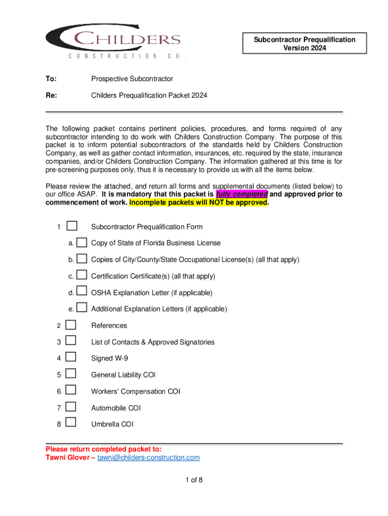 Subcontractor Prequalification Version 2024To:Prospective Subcontractor Re:Chillers Prequalification Packet 2024The following packet contains pertinent policies, procedures, and forms required of