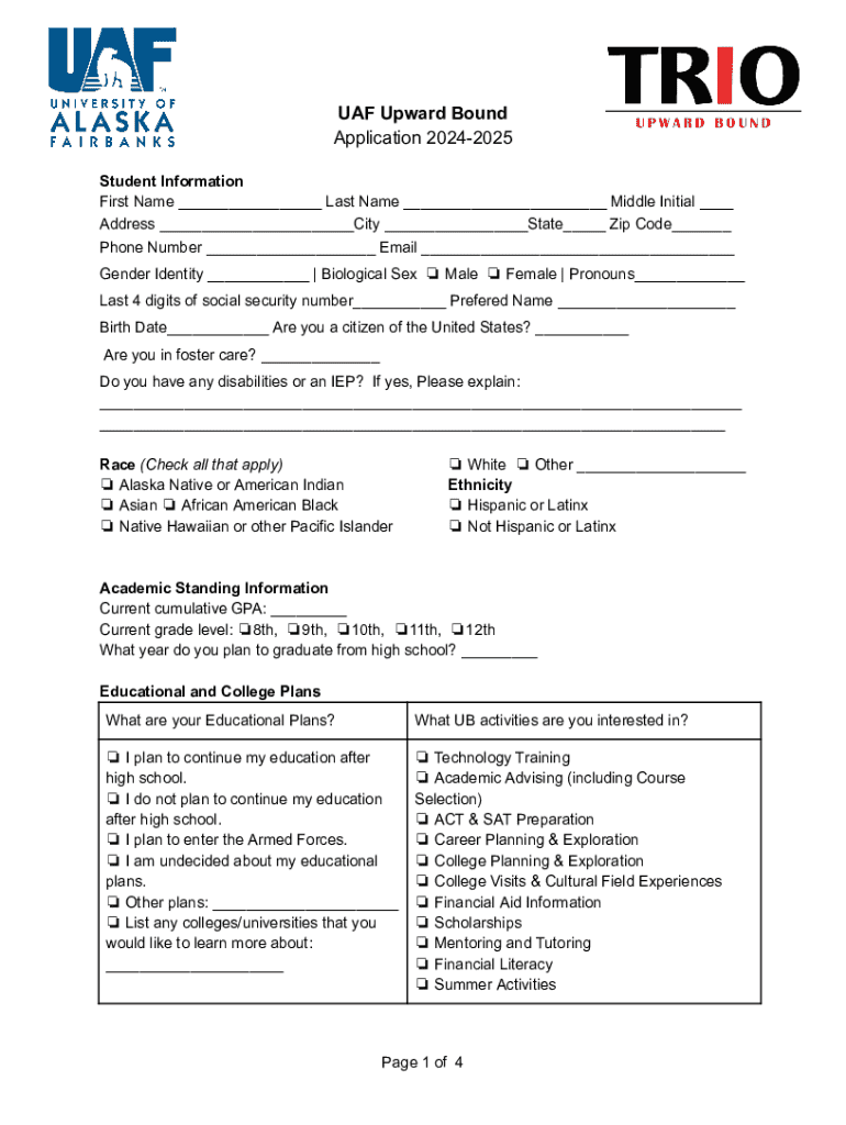 UHF Upward Bound Application 20242025 Student Information First Name ___ Last Name ___ Middle Initial ___ Address ___City ___State___ Zip Code___ Phone Number ___ Email ___ Gender Identity ___ | Biological
