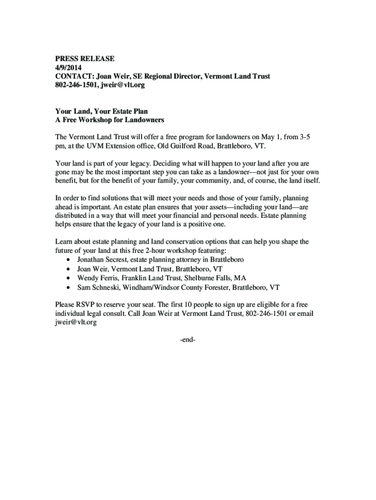 PRESS RELEASE 4/9/2014 CONTACT: Joan Weir, SE Regional Director, Vermont Land Trust 8022461501, jweir@vlt.orgYour Land, Your Estate Plan A Free Workshop for Landowners The Vermont Land Trust will