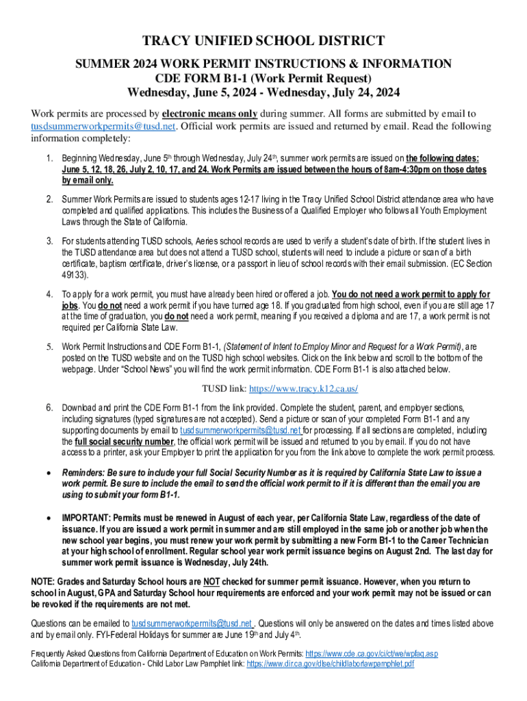 TRACY UNIFIED SCHOOL DISTRICT SUMMER 2024 WORK PERMIT INSTRUCTIONS & INFORMATION CDE FORM B11 (Work Permit Request) Wednesday, June 5, 2024 Wednesday, July 24, 2024 Work permits are processed by electronic