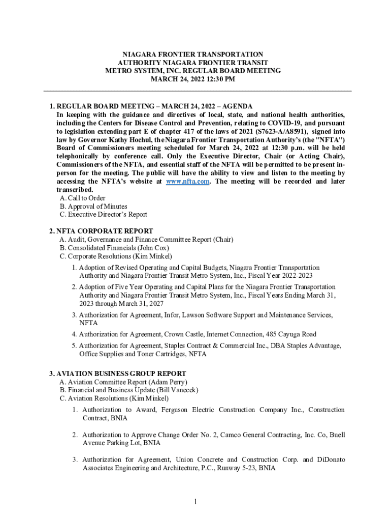 NIAGARA FRONTIER TRANSPORTATION AUTHORITY NIAGARA FRONTIER TRANSIT METRO SYSTEM, INC. REGULAR BOARD MEETING MARCH 24, 2022 12:30 PM 1. REGULAR BOARD MEETING MARCH 24, 2022, AGENDA In keeping with