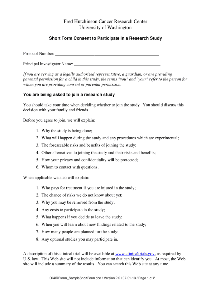 Get the free Short-Form Consent to Participate in a Research Study