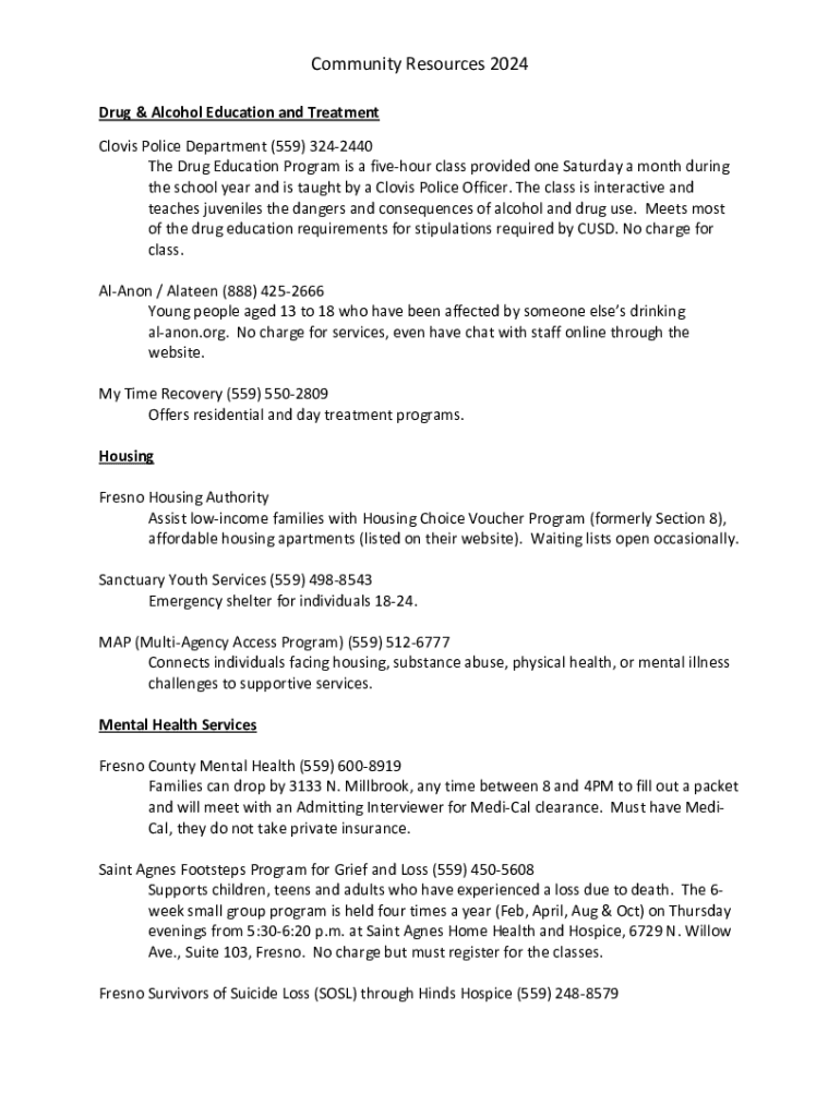 Community Resources 2024 Drug & Alcohol Education and Treatment Clovis Police Department (559) 3242440 The Drug Education Program is a five hour class provided one Saturday a month during the school