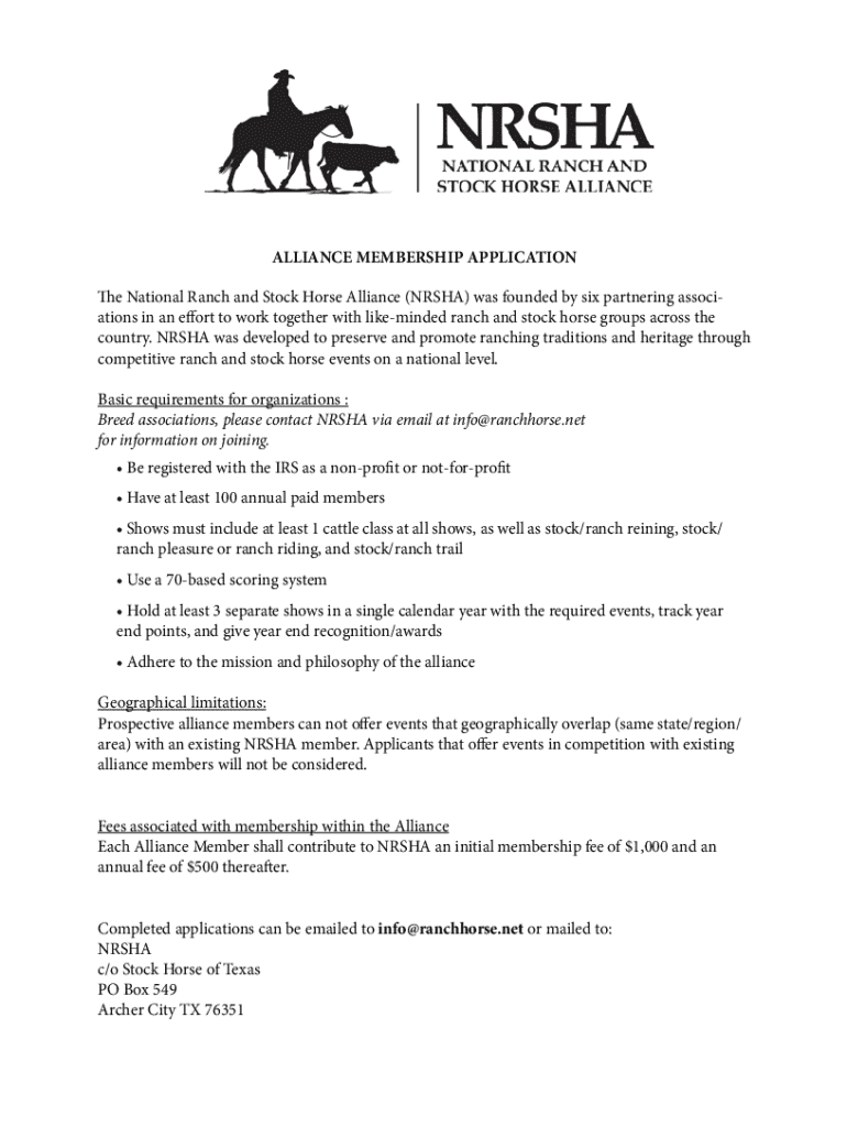 ALLIANCE MEMBERSHIP APPLICATION The National Ranch and Stock Horse Alliance (NRSHA) was founded by six partnering associations in an effort to work together with likeminded ranch and stock horse groups