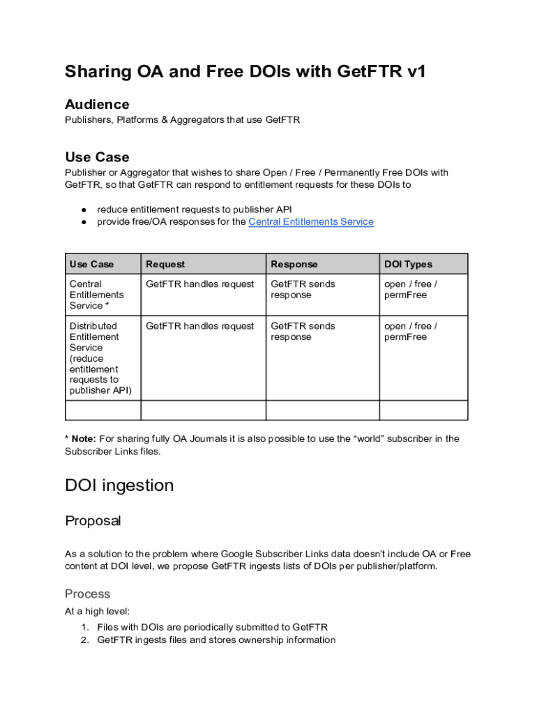 Sharing OA and Free DOIs with GetFTR v1 Audience Publishers, Platforms & Aggregators that use GetFTRUse Case Publisher or Aggregator that wishes to share Open / Free / Permanently Free DOIs with GetFTR,