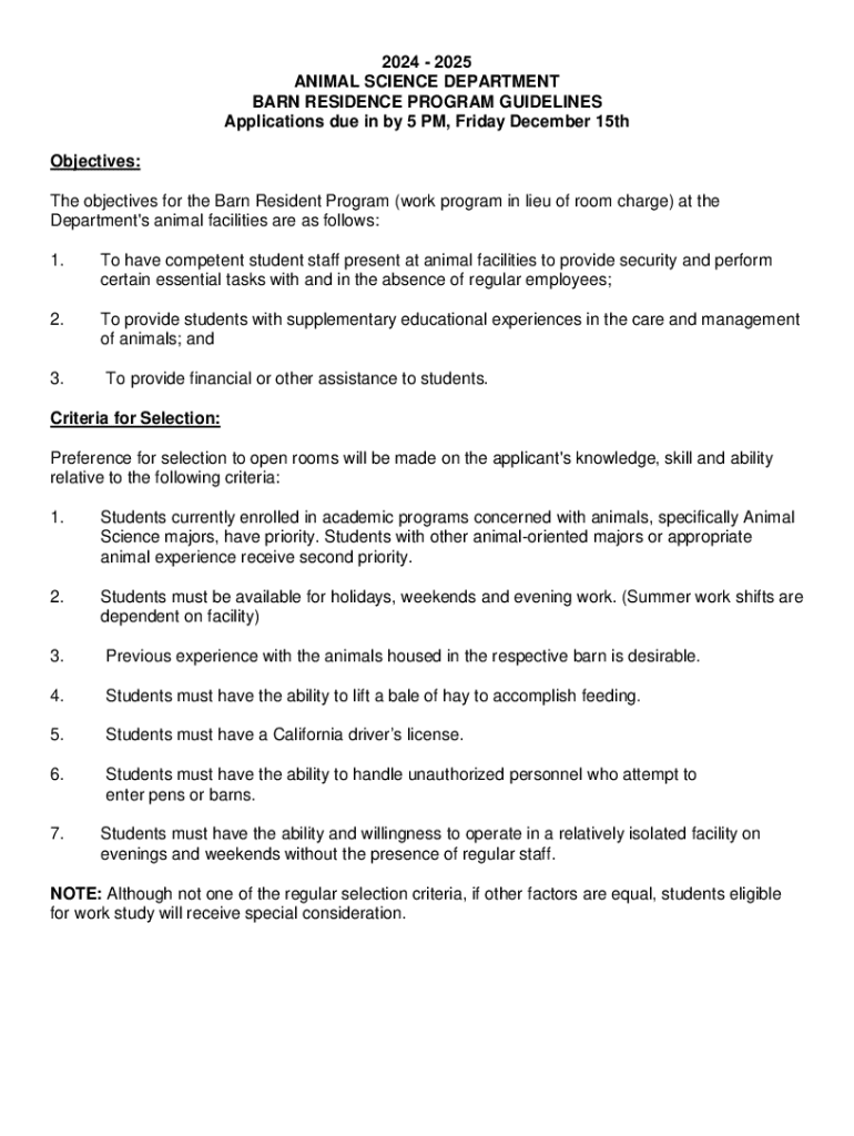2024 2025 ANIMAL SCIENCE DEPARTMENT BARN RESIDENCE PROGRAM GUIDELINES Applications due in by 5 PM, Friday December 15th Objectives: The objectives for the Barn Resident Program (work program in lieu