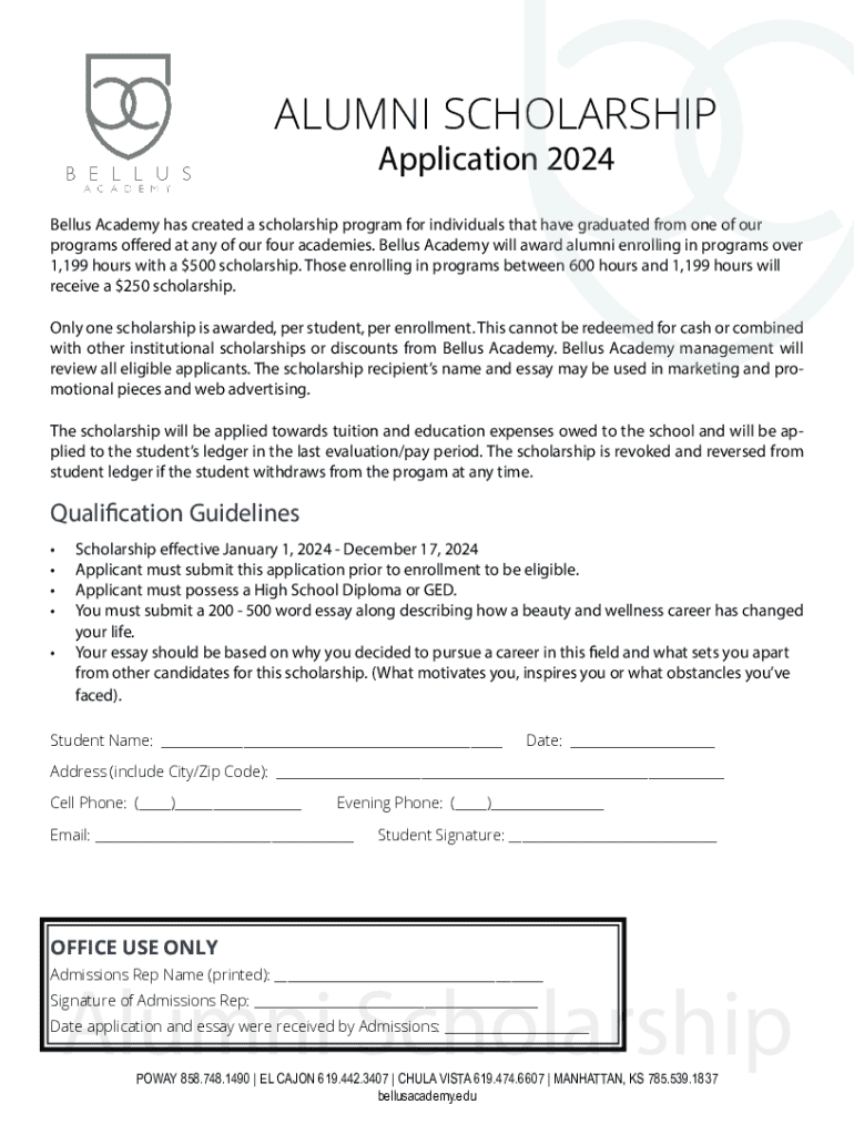 ALUMNI SCHOLARSHIP Application 2024Bellus Academy has created a scholarship program for individuals that have graduated from one of our programs offered at any of our four academies. Bellus Academy