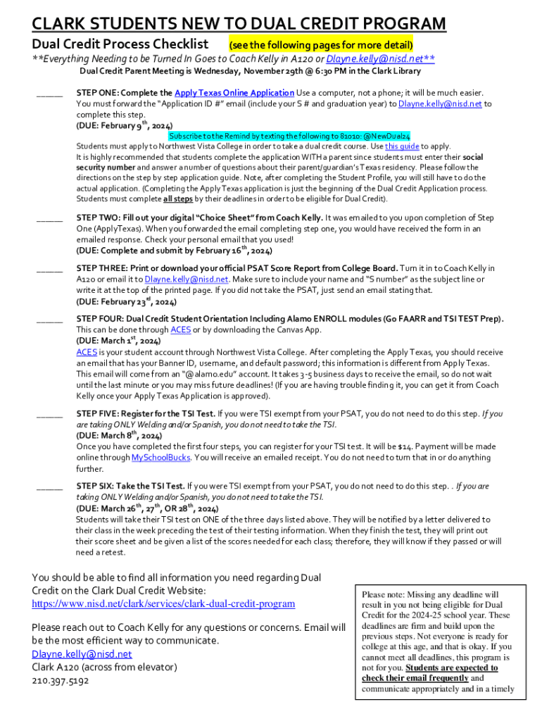 CLARK STUDENTS NEW TO DUAL CREDIT PROGRAM Dual Credit Process Checklist(see the following pages for more detail) **Everything Needing to be Turned In Goes to Coach Kelly in A120 or Dlayne.kelly@nisd.net**