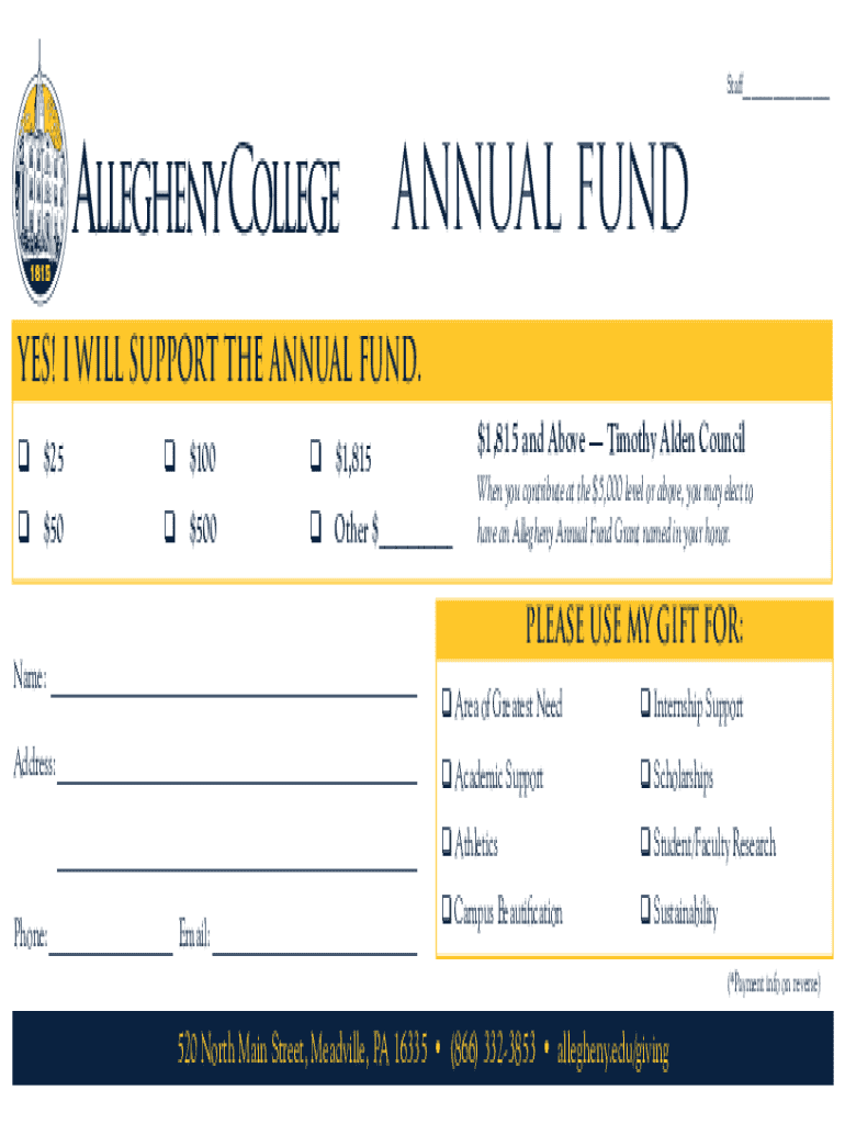 Staff___ANNUAL FUND YES! I WILL SUPPORT THE ANNUAL FUND. $1,815 and Above Timothy Alden Council $$25100 $$1,81550 $500 Other $___Name:___ Address:___ ___ Phone:___ Email:___When you contribute at