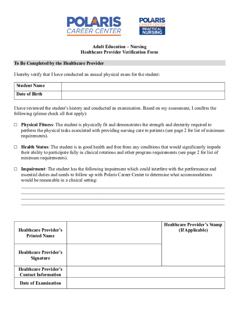 Adult Education Nursing Healthcare Provider Verification Form To Be Completed by the Healthcare Provider I hereby verify that I have conducted an annual physical exam for the student: Student Name